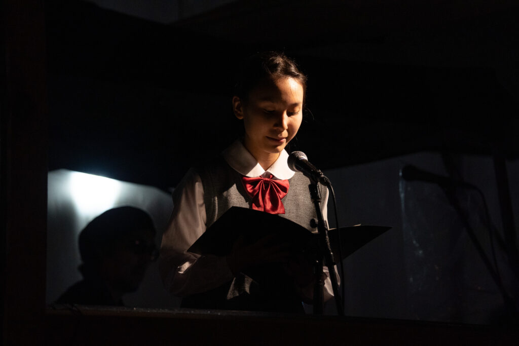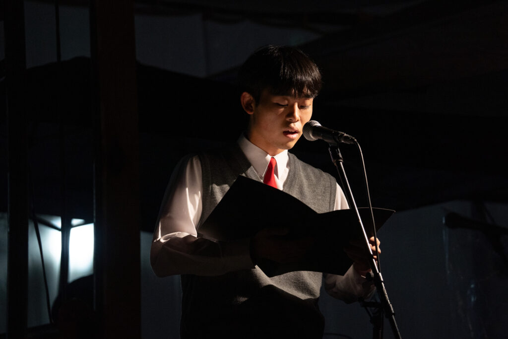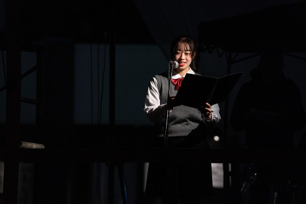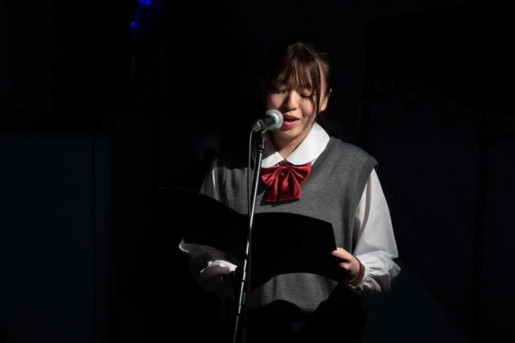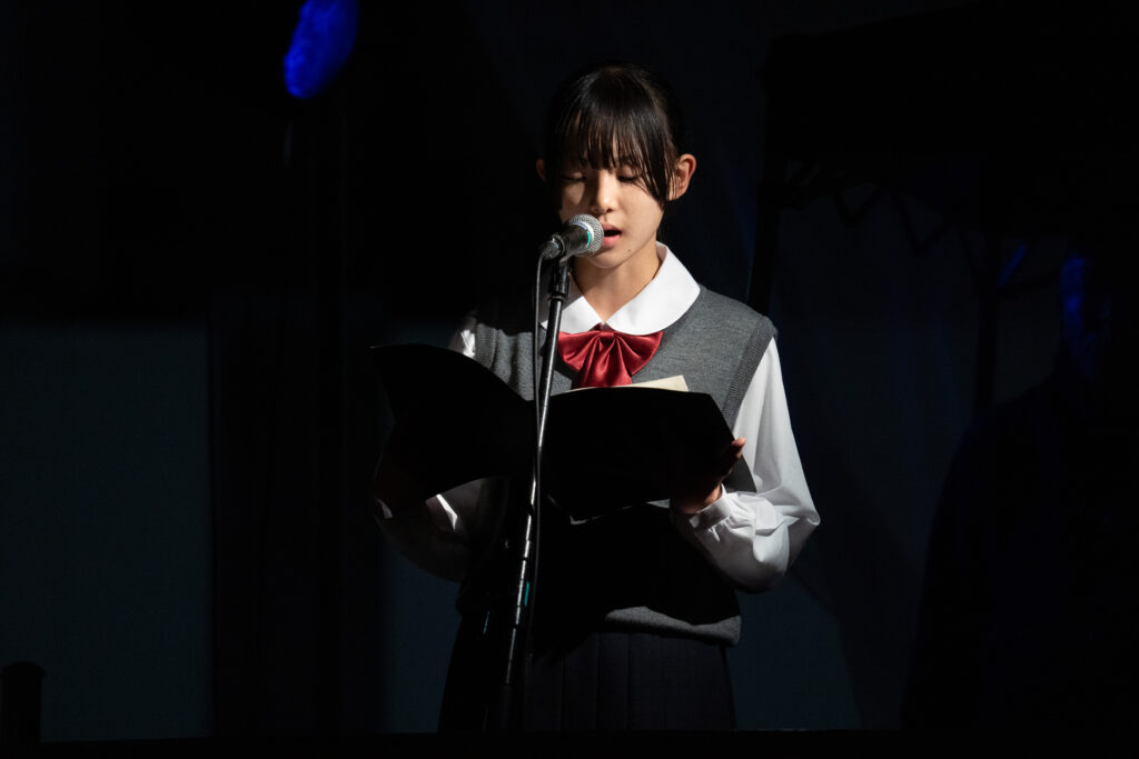 プログラムの幕間では、すみだ少年少女合唱団のメンバー5名による朗読が行われました。朗読されたのは「疎開したおわん」という戦前に墨田で生まれた女性・星野光世さんの人生の物語。疎開や東京大空襲、戦争孤児としての経験、結婚、そして両親の形見のお椀を手にしたことなどが語られます。聴く人それぞれが、その女性の人生を思い描きながら、すみだの土地の記憶と重ね合わせます。