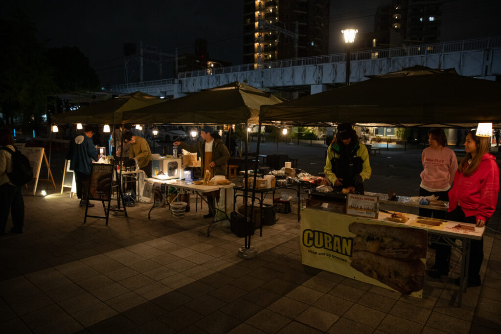 「LATTEST SPORTS」で開催中の「名前はまだないマーケット」に移動すると、食べ物や飲み物、雑貨など様々なお店があり、賑わっていました。奥のDJブースでは、ライブを終えた曽我部恵一さんが出演。皆さん音楽に合わせて体を揺らしたり、お酒を飲んだり、それぞれに週末の夜を楽しんでいました。