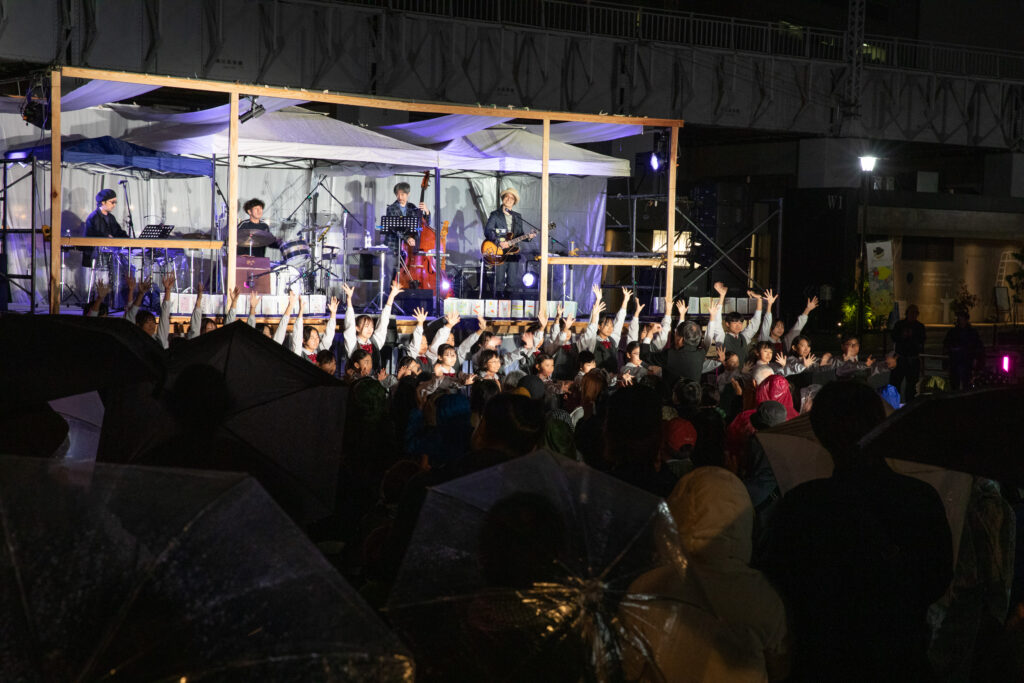会場となった隅田公園は、1923年の関東大震災からの復興のために整備され、1945年の東京大空襲後には、亡くなった方々の仮埋葬地にもなった場所です。今回のライブでは、アーティストやミュージシャンの歌や演奏を通して、この土地が抱えてきた過去を振り返りながら、ジュニア・オーケストラやすみだ少年少女合唱団の皆さんのような若い世代との共演によって、これからの未来を思い描くような時間が生まれました。