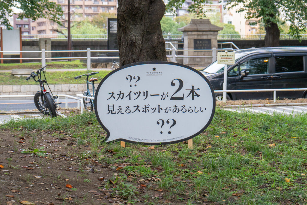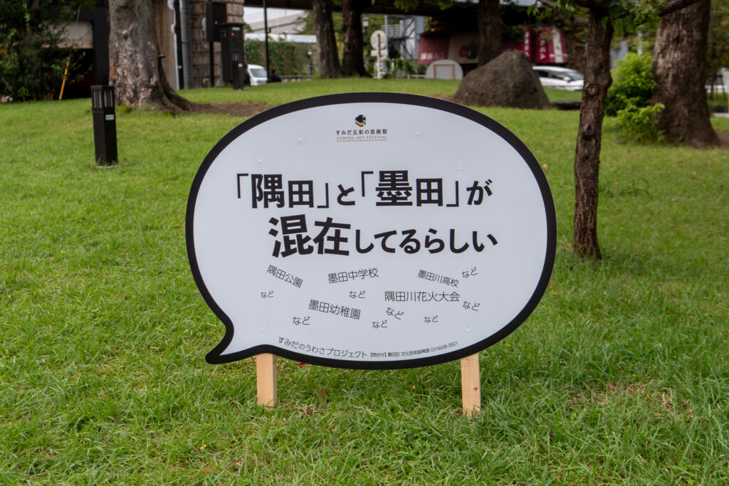 隅田公園内に設置された「うわさ」の吹き出しは、今後もしばらく展示される予定。お近くにお越しの際は、ぜひすみだのうわさを探してみてください。